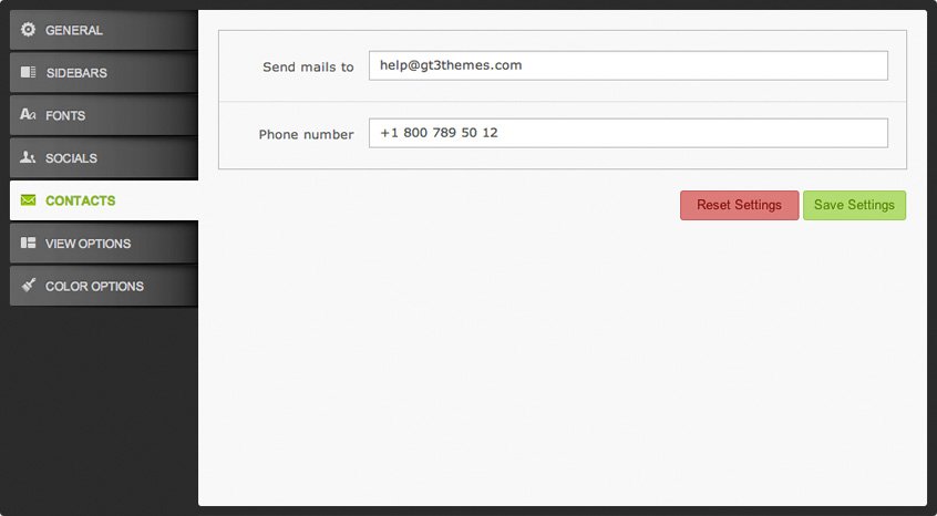 This is a special option for adding contact details. The mail field activates feedback form for getting e-mails from customers. The phone number will be displayed in the Tag line at the top of the website.