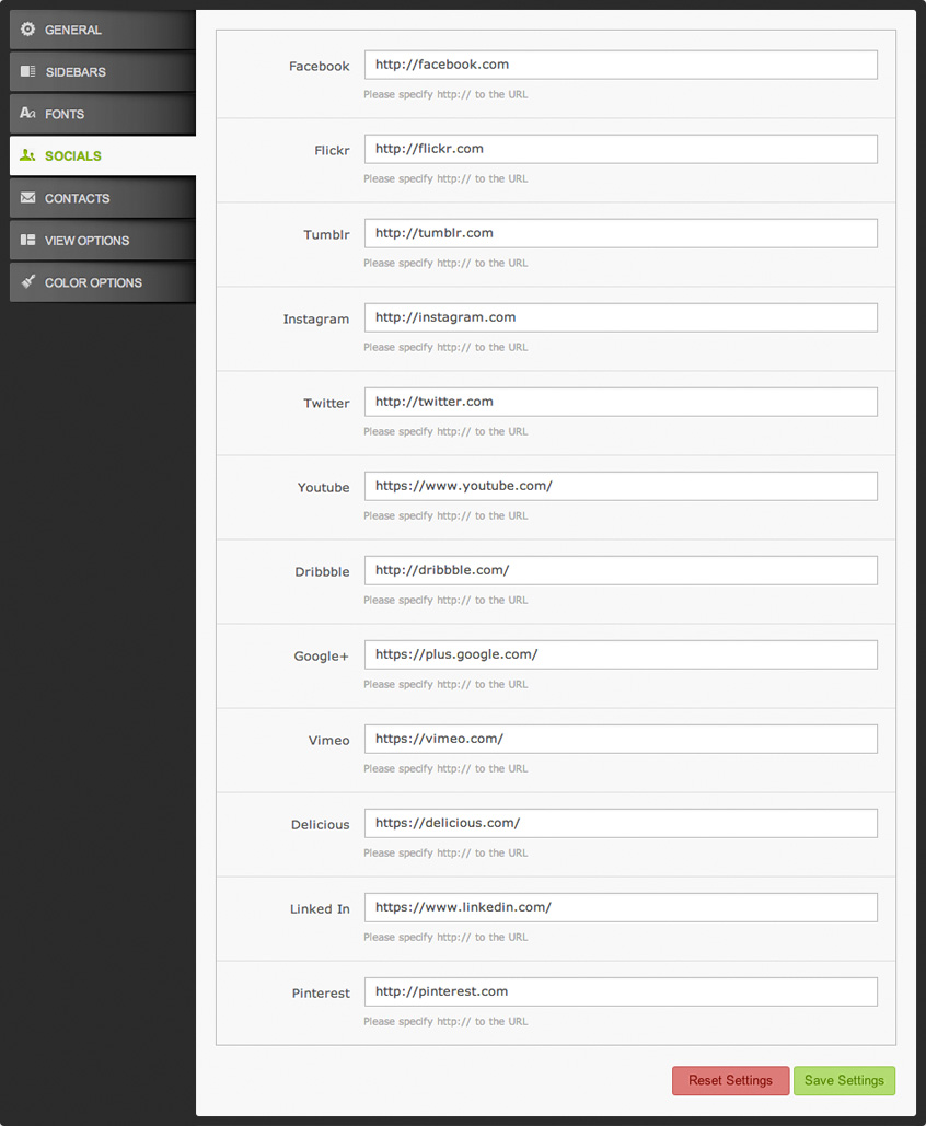 Socials is a part of the theme settings for adding social networks urls and details for the theme. It integrates a website with popular communities and activates sharing features. There are special fields for Twitter API details.