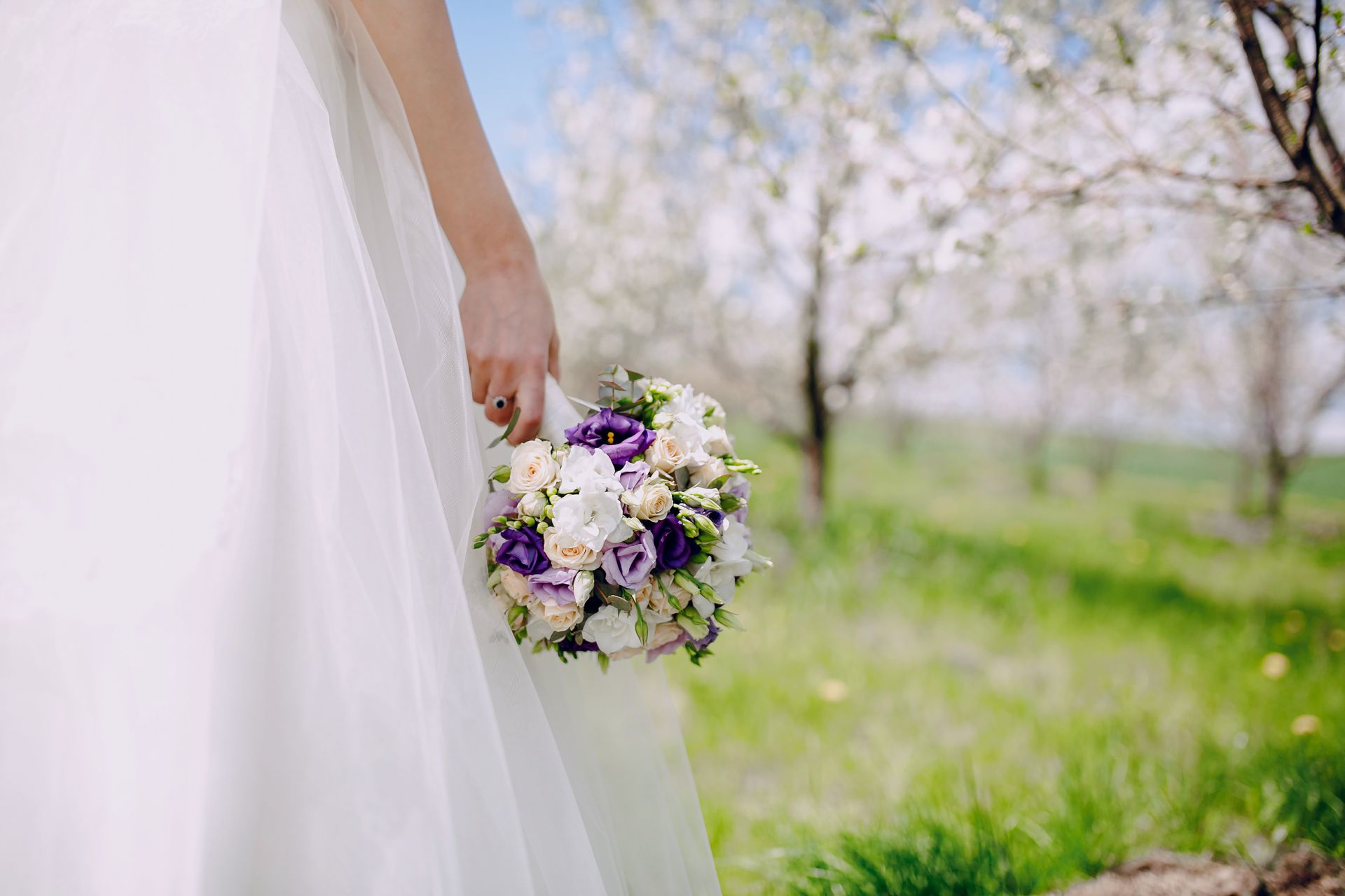 Wedding couple near cherry blossom